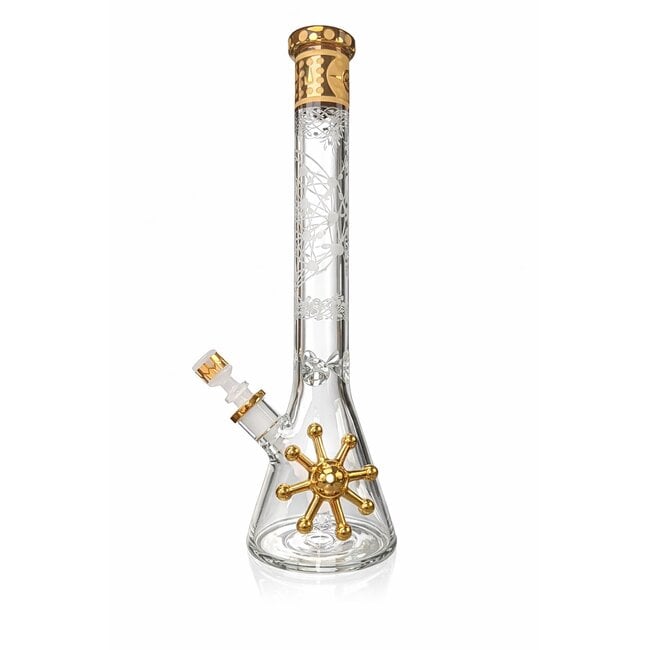 Upgrade your collection with the 16'' JUICY J Gold Geometric Flow Beaker Bong – JJ244, a premium statement piece designed for smooth performance and luxury aesthetics. This tall beaker-style water pipe features a crystal-clear glass body accented with stunning electroplated gold details, delivering both durability and eye-catching appeal.