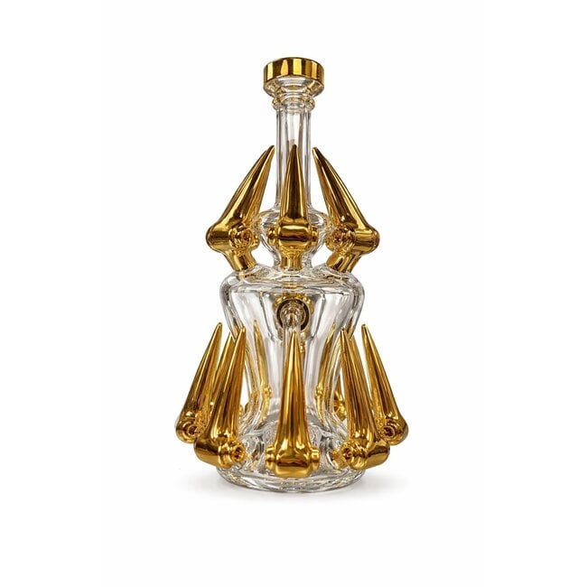 Upgrade your collection with the bold and luxurious 10" JUICY J Golden Mechanics Bong (JJ274)—a true statement piece that combines futuristic design with high-performance functionality. Featuring a crystal-clear glass body enhanced with striking gold-plated mechanical spike accents, this bong delivers both aesthetic appeal and smooth smoking sessions.